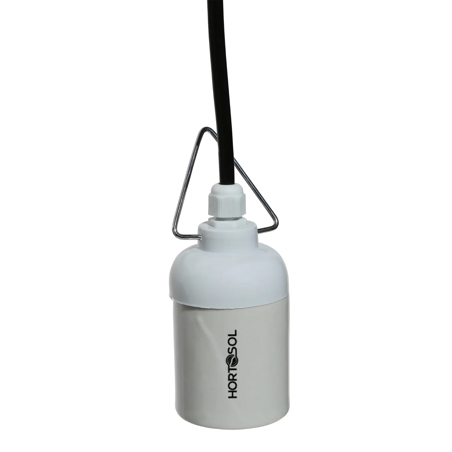 Der Hortosol E40 Lampen Aufhänger ist eine vollständig verkabelte E40 Fassung mit einem zusätzlichen Metallhaken, der eine vertikale Befestigung Ihrer Lampen ermöglicht. Diese Lösung ist besonders nützlich, um Lampen mit integriertem Vorschaltgerät (wie die Energiesparlampen von Hortosol) aufzuhängen. Sie eignet sich ideal für den Einsatz zwischen großen Pflanzen, da die Lampe in einem vertikalen Winkel positioniert wird. Für Lampen, die ein externes Vorschaltgerät benötigen (wie HPS und MH-Lampentypen), ist dieser Aufhänger jedoch nicht geeignet.